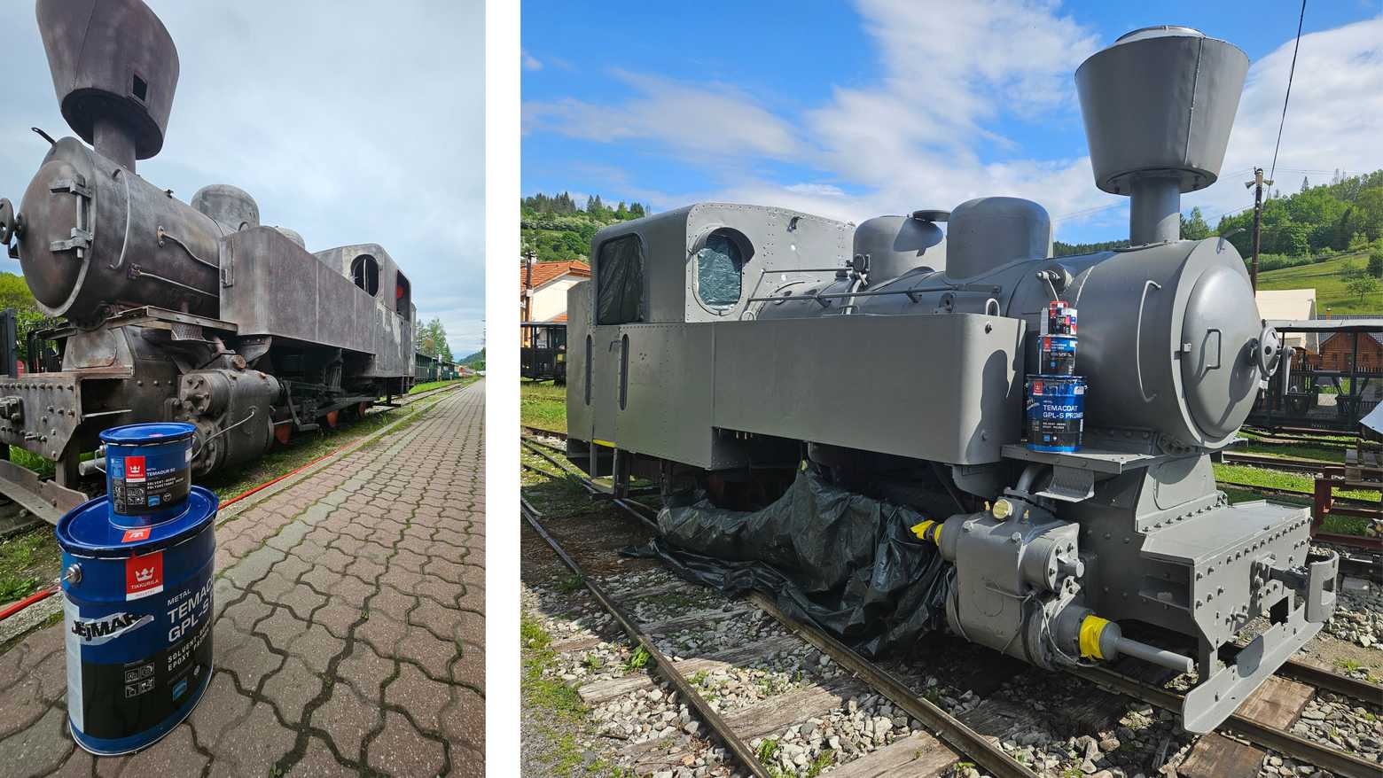 Vrchní nátěr tvořila polyuretanová barva Tikkurila TEMADUR 90 s vysokým leskem, známá svou dlouhodobou odolností vůči povětrnostním vlivům a UV záření. Tato kombinace nátěrů lokomotivě navrátila krásný lesk a zajistí jí i dlouhodobou ochranu.